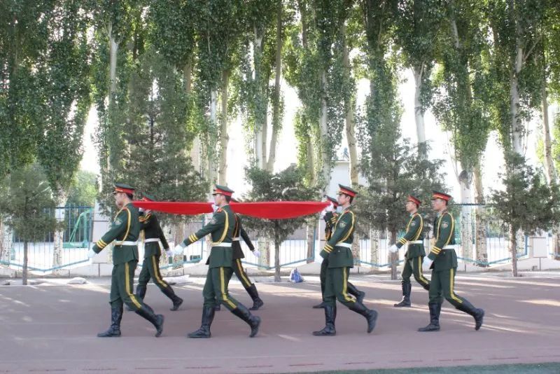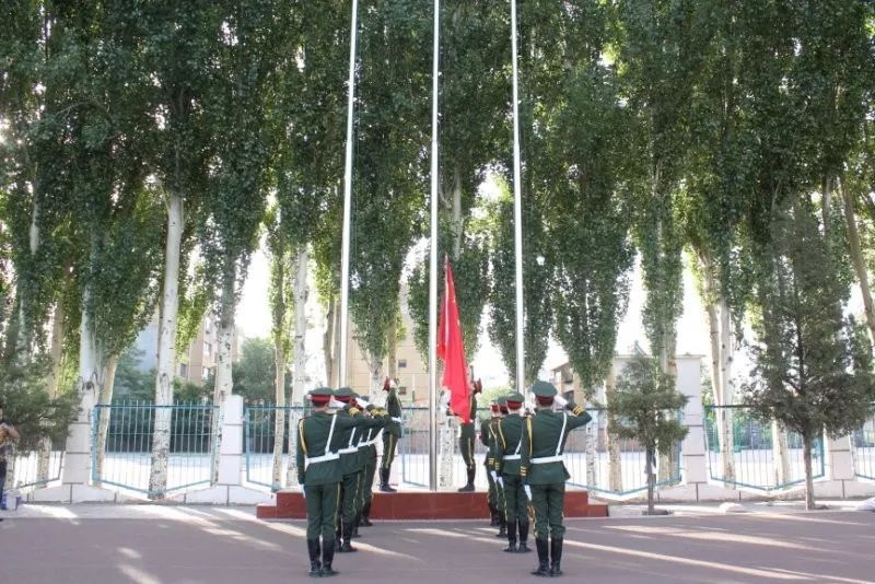 六点四十分,阳光明媚,空气清新。国旗护卫队队员迈着整齐的步伐护送五星红旗入场。随着雄壮的国歌声响起,五星红旗冉冉升起。全场师生肃立行注目礼,望着飘扬的旗帜,满怀自豪与激动之情。