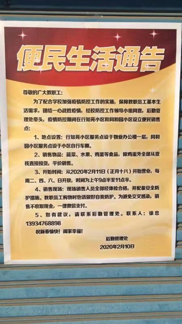 为强化落实学校疫情防控工作的各项措施,切实保证疫情期间教职工生活必需,2月8日,校防控工作领导小组召开会议,研究决定由后勤管理处牵头,在御东校区同和园、行知苑等两个家属院内设立临时蔬菜销售点,自2月10日(正月十七)起正式营业。