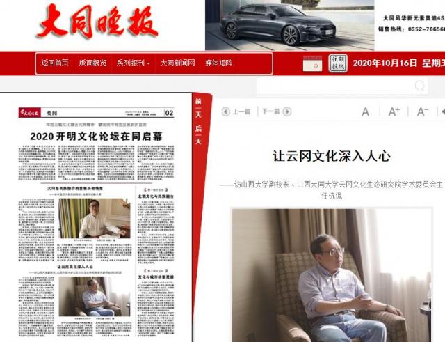 10月15日,主旨演讲结束后,记者采访了山西大学副校长、山西大同大学云冈文化生态研究院学术委员会主任杭侃。