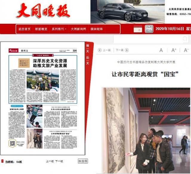 本报讯(记者辛莉莉)15日,“丹青重宝·经典再现”中国历代古书画精品仿复制展在大同大学逸夫美术教学楼启幕,展出甄选的历代名家近百幅仿复制品,为同大学子及市民带来“国宝”盛宴,展览持续至10月25日。