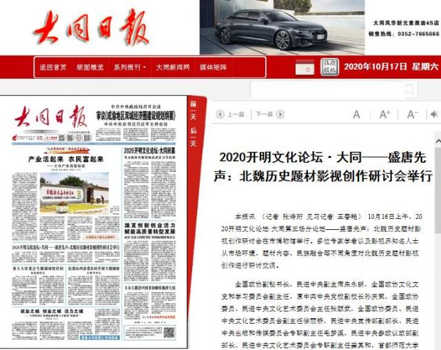本报讯(记者张诗珩见习记者王春艳)10月16日上午,2020开明文化论坛·大同第三场分论坛——盛唐先声:北魏历史题材影视创作研讨会在市博物馆举行。多位专家学者以及影视界知名人士从市场环境、题材内容、民族融合等不同角度对北魏历史题材影视创作进行研讨交流。