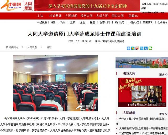 黄河新闻网大同讯(记者胡雁)12月30日下午,大同大学邀请厦门大学薛成龙博士,为大同大学教学管理干部及骨干教师代表进行线上培训。本次培训会由大同大学教务部部长苏鹏主持,各学院院长、教学副院长、教学督导委员、大同大学省级精品共享课程负责人及有意愿参加教学创新大赛的部分教师约200人参加培训。