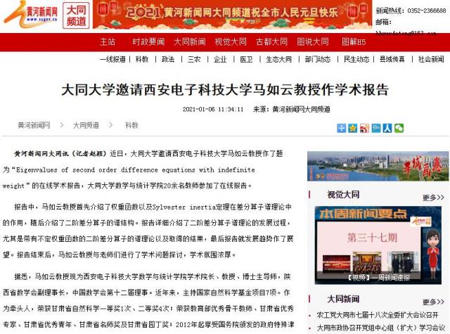 黄河新闻网大同讯(记者赵颖)近日,大同大学邀请西安电子科技大学马如云教授作了题为“Eigenvalues of second order difference equations with indefiniteweight”的在线学术报告,大同大学数学与统计学院20余名教师参加了在线报告。