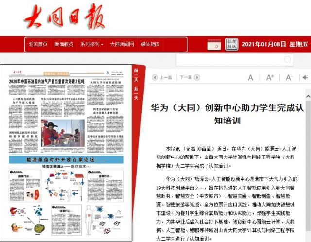 本报讯(记者郑苗苗)近日,在华为(大同)能源云+人工智能创新中心的帮助下,山西大同大学计算机与网络工程学院(大数据学院)大二学生完成了认知培训。