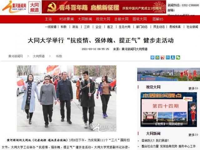 黄河新闻网大同讯(记者赵颖通讯员余致楠)3月8日下午,为庆祝第111个“三八”国际妇女节,大同大学工会举办“抗疫情、强体魄、提正气”健步走活动。大同大学党委副书记孙彦,大同大学纪委书记张有茀等出席启动仪式,并与女教职工共同进行健步走活动。大同大学工会主席侯桂兰主持活动仪式。