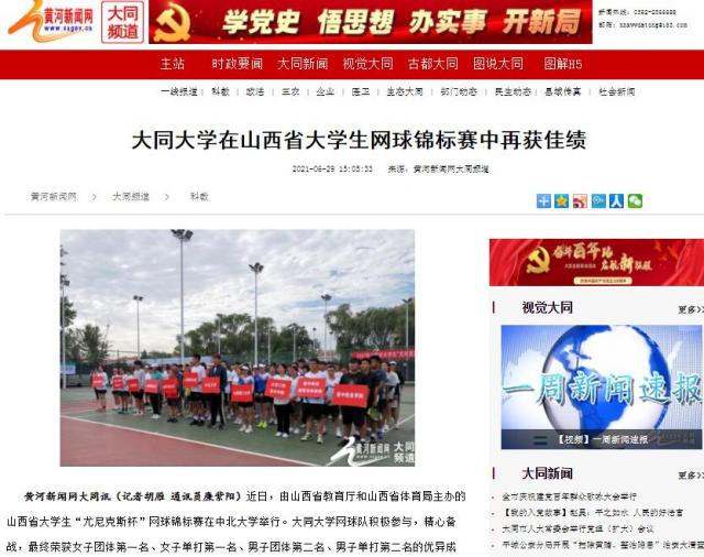 黄河新闻网大同讯(记者胡雁通讯员廉紫阳)近日,由山西省教育厅和山西省体育局主办的山西省大学生“尤尼克斯杯”网球锦标赛在中北大学举行。大同大学网球队积极参与,精心备战,最终荣获女子团体第一名、女子单打第一名、男子团体第二名、男子单打第二名的优异成绩。其中,女子团体和女子单打连续三年蝉联总冠军,男子团体取得了有史以来的最好成绩。