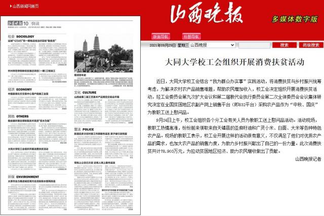 近日,大同大学校工会结合“我为群众办实事”实践活动,将消费扶贫与乡村振兴统筹考虑,为解决农村农产品销售难题,帮助农民增加收入,校工会决定组织开展消费扶贫活动,经工会委员会第九次扩大会议和第二届教代会执行委员会第二次全体委员会会议集体研究决定在全国贫困地区农副产网上销售平台(即832平台)采购农产品作为“中秋、国庆”为教职工送上慰问品。