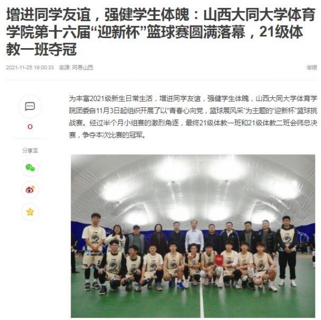 为丰富2021级新生日常生活,增进同学友谊,强健学生体魄,山西大同大学体育学院团委自11月3日起组织开展了以“青春心向党,篮球展风采”为主题的“迎新杯”篮球挑战赛。经过半个月小组赛的激烈角逐,最终21级体教一班和21级体教二班会师总决赛,争夺本次比赛的冠军。