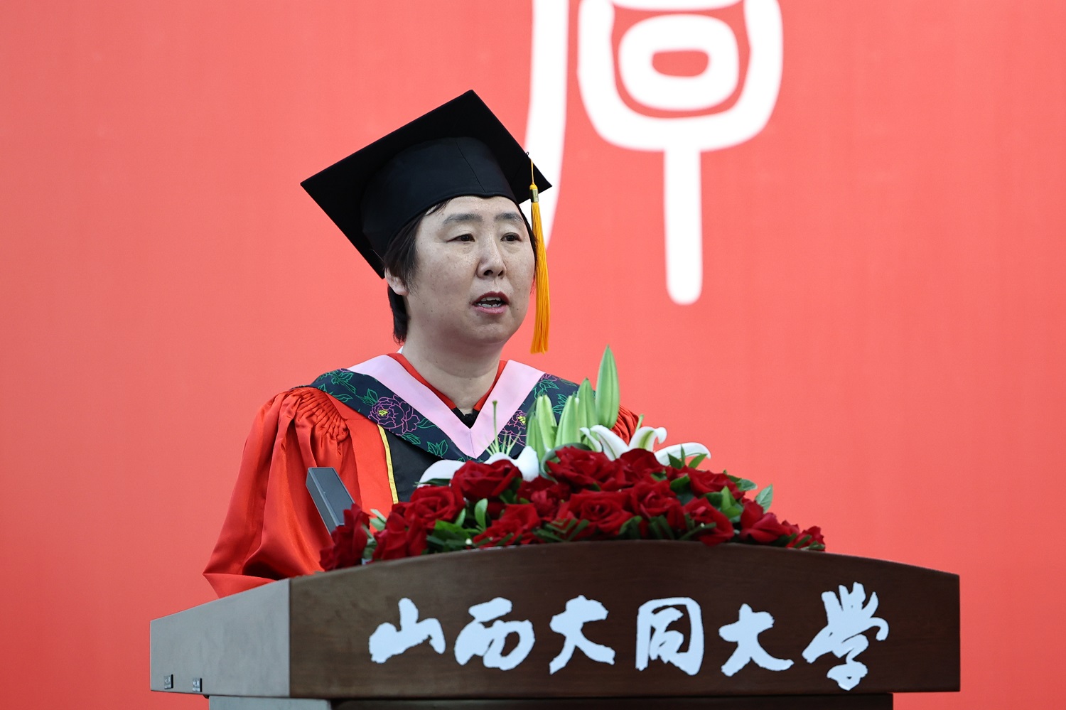 优秀研究生代表、中国语言文学专业硕士研究生刘芳同学代表全体毕业研究生真诚感谢母校的精心栽培,发出“同大强音”:凝聚智慧、胸怀大志、脚踏实地,追寻“大同”梦想,实现远大抱负,用青春的智慧和汗水打拼出一个更加美好的中国!