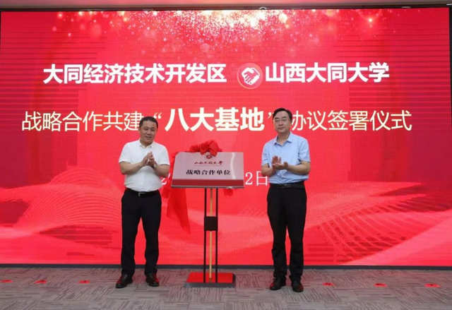 大同大学授予大同经济技术开发区战略合作单位。赵水民与赵学斌共同为其揭牌。