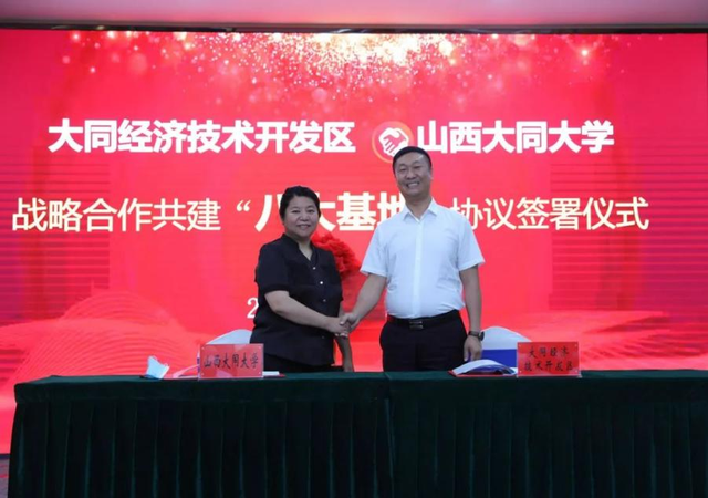 近日,山西大同大学与大同经济技术开发区签署共建“八大基地”战略合作协议。这是校地双方大力实施科教创新和人才强省战略,共谋合作共赢共促高质量发展的重要举措。校党委书记赵水民,大同市人民政府副市长、大同经济开发区党工委书记、主任赵学斌出席仪式并致辞。校党委副书记寇福明,校党委常委、副校长石凤珍,校党委常委、副校长史水鸿,大同经济技术开发区党工委委员、管委会副主任祝日杰出席仪式。大同经济技术开发区党工委委员孙娜主持仪式。