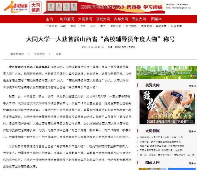黄河新闻网大同讯(记者魏悦)10月25日,山西省教育厅公布了首届山西省“高校辅导员年度人物”名单,按照培优选优,宁缺毋滥的原则,经校级选拔、专家评审、结果公示等环节,共推选出首届山西省“高校辅导员年度人物”10人、“高校辅导员年度人物提名”10人。大同大学体育学院专职政治辅导员张丽被推选为首届山西省“高校辅导员年度人物”。