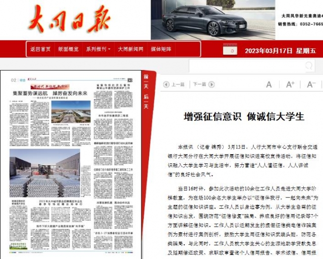 本报讯(记者锦秀)3月13日,人行大同市中心支行联合交通银行大同分行在大同大学开展征信知识进高校宣传活动,将征信知识融入大学生学习与生活中,努力营造“人人懂征信,人人讲诚信”的良好社会风气。