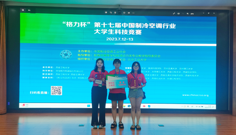 在7月13日举行的“格力杯”第十七届中国制冷空调行业大学生科技竞赛(西部区域)总决赛中,由我校建筑与测绘工程学院武晔秋老师和王利霞老师指导,建筑环境与能源应用工程专业学生吴芙蓉、郎玲玲、张丽雨组成三人小队,参赛作品——《应用于宿舍的太阳能与半导体小型风机盘管》,在比赛中脱颖而出,荣获国家级三等奖,获得了格力公司的面试直通卡。