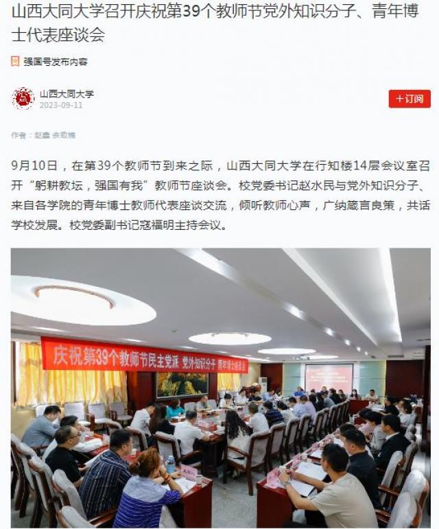 9月10日,在第39个教师节到来之际,山西大同大学在行知楼14层会议室召开“躬耕教坛,强国有我”教师节座谈会。校党委书记赵水民与党外知识分子、来自各学院的青年博士教师代表座谈交流,倾听教师心声,广纳箴言良策,共话学校发展。校党委副书记寇福明主持会议。