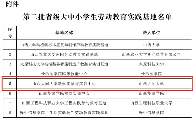10月25日,山西省教育厅发布《关于公布第二批省级大中小学生劳动教育实践基地名单的通知》,我校申报的“山西大同大学教学实验与实训中心”劳动教育实践基地成功入选为山西省第二批省级大中小学生劳动教育实践基地。