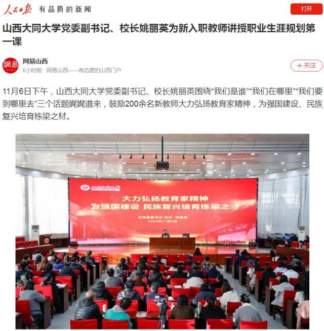 11月6日下午,山西大同大学党委副书记、校长姚丽英围绕“我们是谁”“我们在哪里”“我们要到哪里去”三个话题娓娓道来,鼓励200余名新教师大力弘扬教育家精神,为强国建设、民族复兴培育栋梁之材。