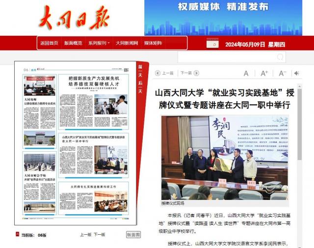本报讯(记者闫春平)近日,山西大同大学“就业实习实践基地”授牌仪式暨“读路遥读人生读世界”专题讲座在大同市第一高级职业中学校举行。