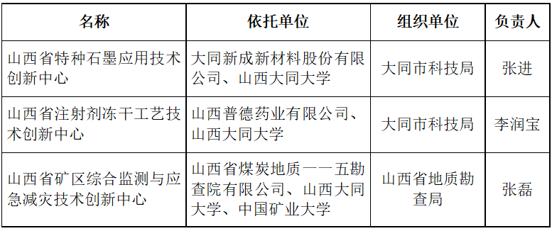 山西省特种石墨应用技术创新中心由大同新成新材料股份有限公司和山西大同大学联合共建,负责人张进;山西省注射剂冻干工艺技术创新中心由山西普德药业有限公司和山西大同大学联合共建,我校负责人张通;山西省矿区综合监测与应急减灾技术创新中心由山西省煤炭地质一一五勘查院有限公司、山西大同大学和中国矿业大学联合共建,负责人张磊。
