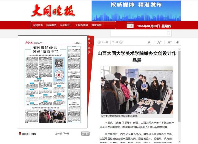 本报讯(记者 丁亚琴)近日,山西大同大学美术学院文创产品设计作品展开幕,琳琅满目的展品吸引了众多师生前来观展。