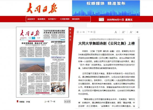 本报讯(记者 丁亚琴 通讯员 赵鑫)近日,教育部公布2025年度全国高校思政原创文化精品项目名单,由大同大学音乐学院教师李莉主创的舞蹈诗剧《云冈之舞》脱颖而出,成为山西省本科高校唯一入选项目。该剧以世界文化遗产云冈石窟为创作原点,通过“艺术+思政”的创新表达,生动诠释中华优秀传统文化的当代价值,为新时代高校思想政治教育提供鲜活范本。