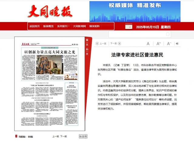 活动中,大同大学副教授刘芳芳以《身边的法律》为主题,结合真实案例用通俗易懂的语言,深入浅出地讲解了与生活密切相关的法律知识。内容涵盖民法中的继承权分配、赡养义务界定,知识产权领域的著作权与专利权保护,以及刑法中的故意伤害、敲诈勒索等法律问题。针对居民关心的“遗产如何继承”“赡养责任如何划分”等热点话题,刘芳芳进行了细致解析,并现场答疑解惑,帮助居民掌握法律常识,提高依法维权能力。