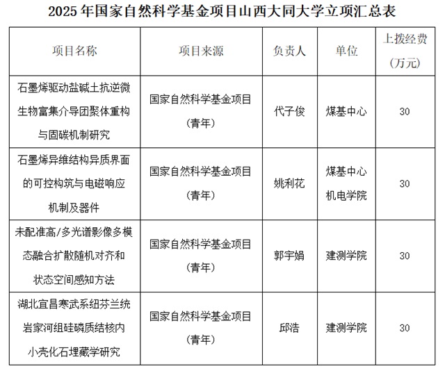8月27日,国家自然科学基金委正式发布《关于2025年国家自然科学基金集中接收申请项目评审结果的通告》。我校获批4项国家自然科学基金青年项目,项目负责人分别为煤基生态碳汇技术教育部工程研究中心代子俊博士,煤基生态碳汇技术教育部工程研究中心、机电工程学院姚利花博士,建筑与测绘工程学院郭宇娟和邱浩博士,资助总经费120万元。