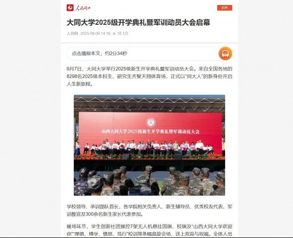 9月7日,大同大学举行2025级新生开学典礼暨军训动员大会。来自全国各地的8298名2025级本科生、研究生齐聚天翔体育场,正式以“同大人”的新身份开启人生新旅程。