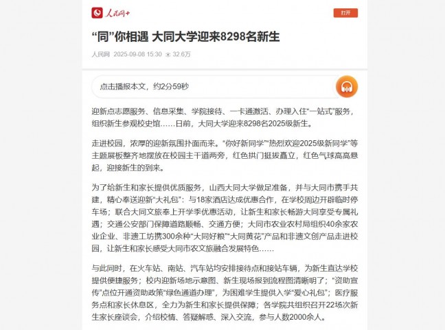 为了给新生和家长提供优质服务,山西大同大学做足准备,并与大同市携手共建,精心奉送迎新“大礼包”:与18家酒店达成优惠合作,在学校周边开辟临时停车场;联合大同文旅奉上开学季优惠活动,让新生和家长畅游大同享受专属礼遇;交通公安部门保障道路顺畅、交通方便;大同市农业农村局组织40余家农业企业、非遗工坊携300余种“大同好粮”“大同黄花”产品和非遗文创产品走进校园,让新生和家长感受大同市农文旅融合发展特色……