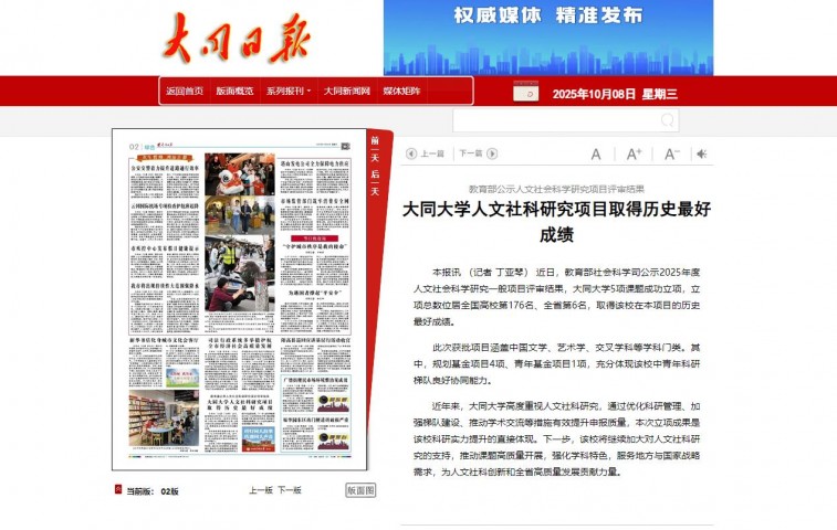本报讯 (记者 丁亚琴) 近日,教育部社会科学司公示2025年度人文社会科学研究一般项目评审结果,大同大学5项课题成功立项,立项总数位居全国高校第176名、全省第6名,取得该校在本项目的历史最好成绩。