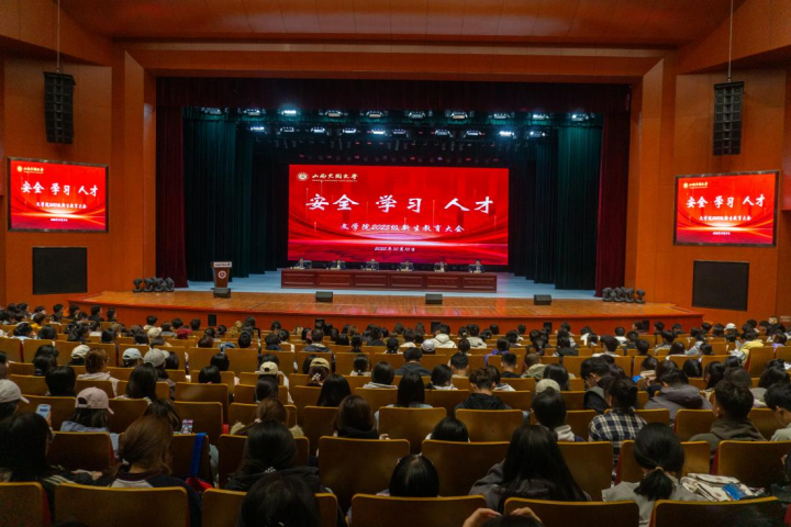 锚定新起点,蓄力向未来。为帮助2025级新生尽快适应大学生活,深入了解学院建设发展情况,树立安全意识,明确学习目标,夯实成长成才之基,10月10日,文学院在本真楼演播厅举行“安全·学习·人才”为主题的2025级新生教育大会。学院领导、系主任、各办公室负责人、专兼职辅导员及全体2025级本科生和研究生参加大会。