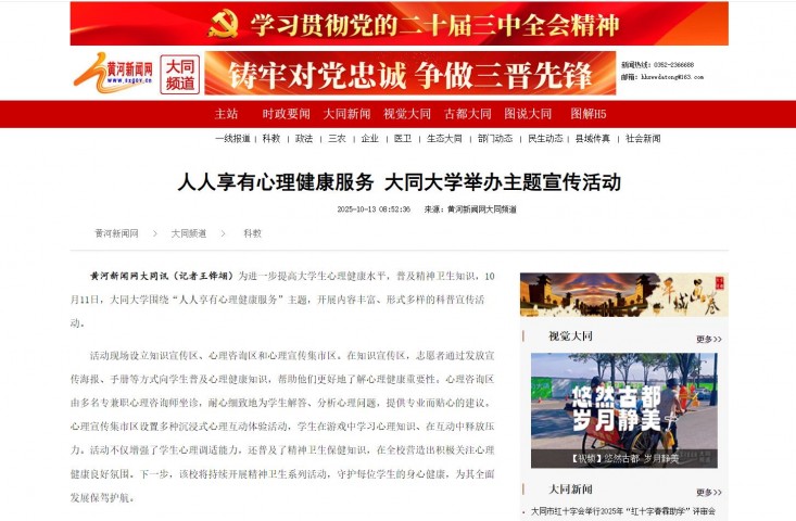 黄河新闻网大同讯(记者王铧翊)为进一步提高大学生心理健康水平,普及精神卫生知识,10月11日,大同大学围绕“人人享有心理健康服务”主题,开展内容丰富、形式多样的科普宣传活动。