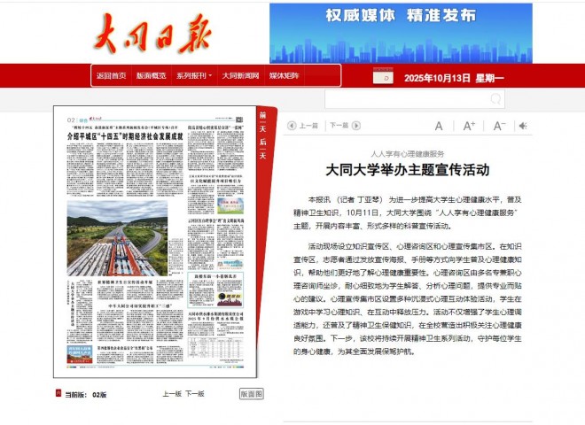本报讯 (记者 丁亚琴) 为进一步提高大学生心理健康水平,普及精神卫生知识,10月11日,大同大学围绕“人人享有心理健康服务”主题,开展内容丰富、形式多样的科普宣传活动。