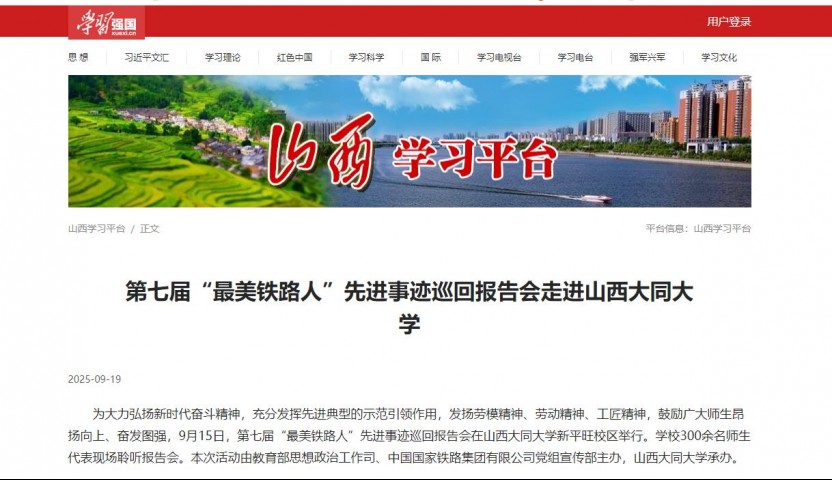 为大力弘扬新时代奋斗精神,充分发挥先进典型的示范引领作用,发扬劳模精神、劳动精神、工匠精神,鼓励广大师生昂扬向上、奋发图强,9月15日,第七届“最美铁路人”先进事迹巡回报告会在山西大同大学新平旺校区举行。学校300余名师生代表现场聆听报告会。本次活动由教育部思想政治工作司、中国国家铁路集团有限公司党组宣传部主办,山西大同大学承办。