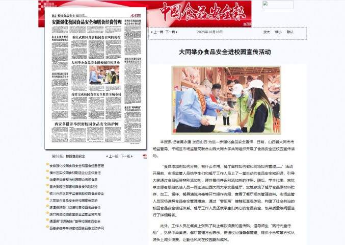 本报讯 记者黄永建 发自山西 为进一步强化食品安全宣传,日前,山西省大同市市场监管局、平城区市场监管局联合山西大同大学共同组织开展了食品安全进校园宣传活动。