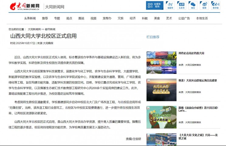 近日,山西大同大学北校区正式投入使用,标志着该校办学条件与基础设施建设迈入新阶段,将为多学科教学实践、科研创新及师生校园生活提供更优质的保障。