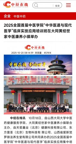 中经在线讯10月18日,由山西大同大学中医药健康服务学院、大同黄经世家中医康养小镇联合主办,由天笙鑫业(北京)健康科技有限公司、东方雷圣(北京)生物科技有 限公司、山西省爱新觉罗御法养生堂有限公司共同承办的2025全国首届中医学院“中华医道与现代医学”临床实技应用集中培训班,在大同黄经世家中医康养小镇隆重开班。