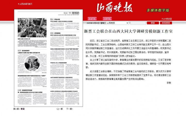近日,浙江省总工会二级巡视员、省教育工会主席王玉庆,浙江中医药大学附属第二医院党委副书记、工会主席贺晓鸣,山西省科教文卫体工会常务副主席尹玉平一行,赴山西大同大学就劳模创新工作室建设、运行及成果转化工作开展交流座谈与专题调研。校党委书记赵水民,党委副书记、校长姚丽英,党委副书记张卫国出席活动,学校组织统战部、宣传部、办公室、校工会等相关职能部门负责人参加座谈。