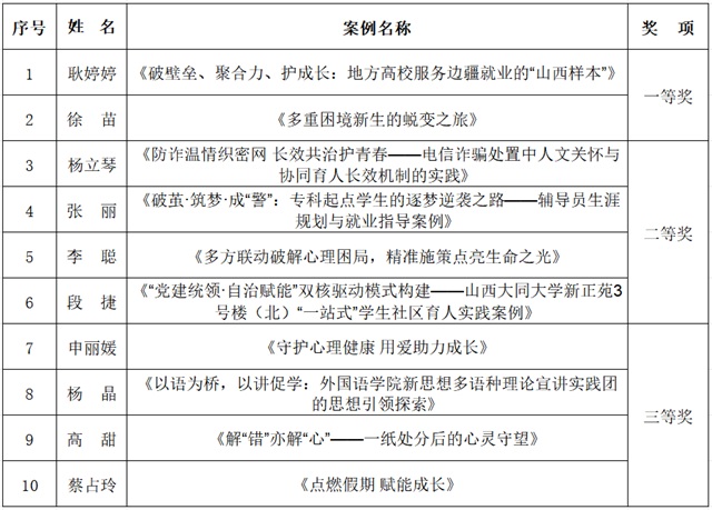 近日,在山西省教育厅主办的2025年高校辅导员工作优秀案例评比活动中,我校辅导员队伍表现优异,斩获10个奖项,充分展示了我校学生工作的突出成效。本次评选活动汇聚了全省各高校的众多优秀工作案例,我校共推荐了19个优秀案例参赛,经过专家严格评审,我校推荐的案例脱颖而出,最终荣获一等奖2项、二等奖4项、三等奖4项。
