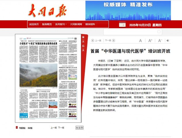 本报讯 (记者 丁亚琴) 近日,由大同大学中医药健康服务学院、大同黄经世家中医康养小镇联合主办的2025全国首届中医学院“中华医道与现代医学”临床实技应用培训班开班。