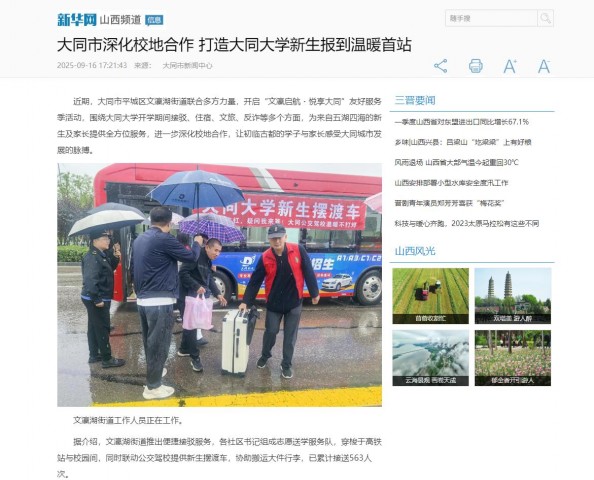 近期,大同市平城区文瀛湖街道联合多方力量,开启“文瀛启航・悦享大同”友好服务季活动,围绕大同大学开学期间接驳、住宿、文旅、反诈等多个方面,为来自五湖四海的新生及家长提供全方位服务,进一步深化校地合作,让初临古都的学子与家长感受大同城市发展的脉搏。