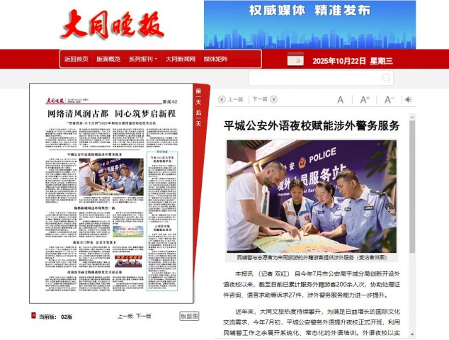 本报讯 (记者 双红) 自今年7月市公安局平城分局创新开设外语夜校以来,截至目前已累计服务外籍游客200余人次,协助处理证件咨询、语言求助等诉求27件,涉外警务服务能力进一步提升。