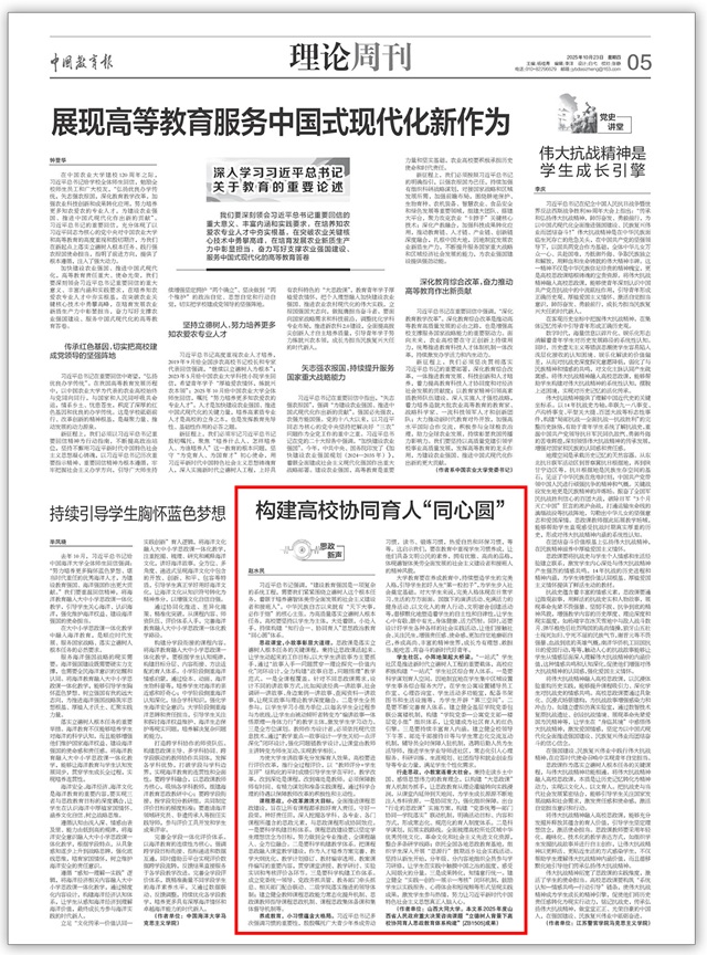 2025年10月23日,中国教育报在第5版刊发了校党委书记赵水民署名文章《构建高校协同育人“同心圆”》,全文如下: