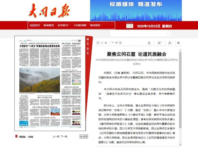 本报讯 (记者 崔莉英) 10月22日,中华民族各民族交往交流交融的叙述与表达学术研讨会暨第四届云冈学论坛在云冈研究院举办。