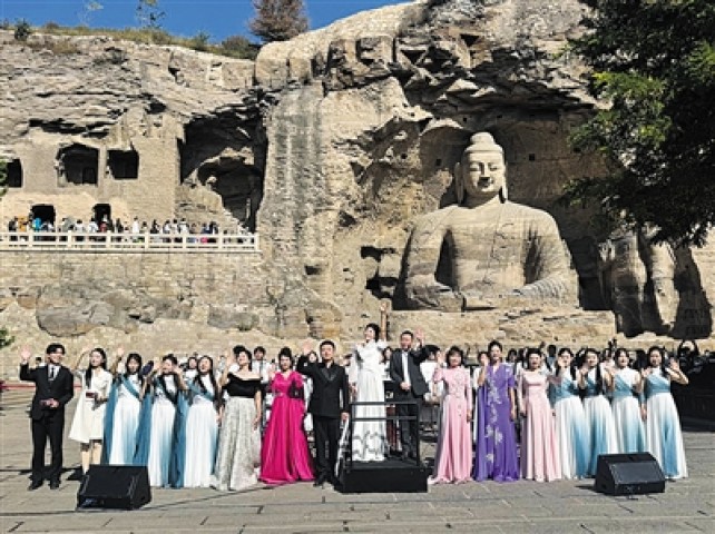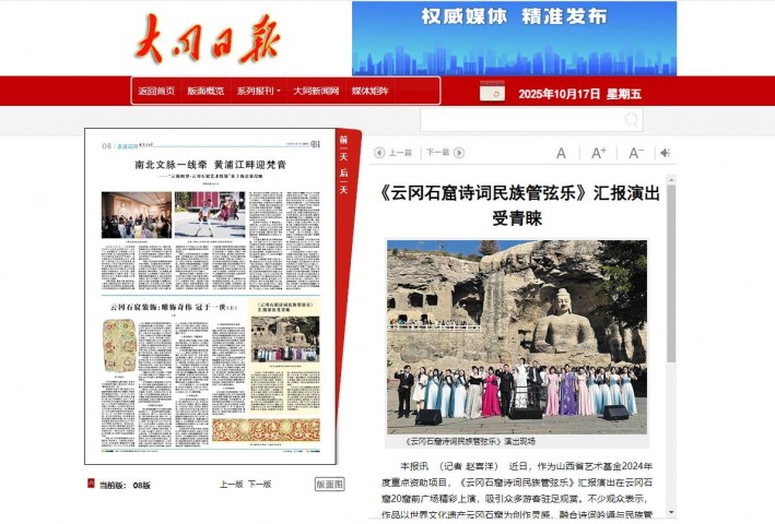 本报讯 (记者 赵喜洋) 近日,作为山西省艺术基金2024年度重点资助项目,《云冈石窟诗词民族管弦乐》汇报演出在云冈石窟20窟前广场精彩上演,吸引众多游客驻足观赏。不少观众表示,作品以世界文化遗产云冈石窟为创作灵感,融合诗词吟诵与民族管弦乐,为观众呈现了一场跨越千年的艺术盛宴,展现了云冈石窟深厚的历史文化底蕴与现代艺术创新力,希望这样的演出能够持续下去。