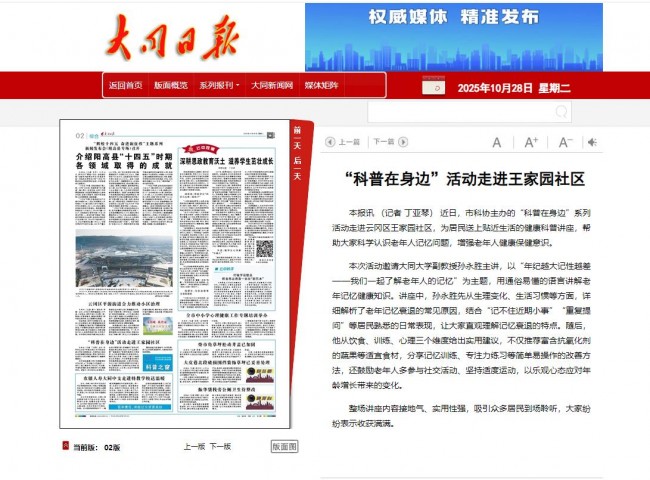 本报讯 (记者 丁亚琴) 近日,市科协主办的“科普在身边”系列活动走进云冈区王家园社区,为居民送上贴近生活的健康科普讲座,帮助大家科学认识老年人记忆问题,增强老年人健康保健意识。