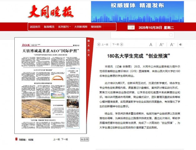 本报讯 (记者 辛雅君) 26日,大同市公共就业服务能力提升示范项目首期创业意识培训(GYB)圆满落幕,来自山西大同大学的180名有创业意愿的学生顺利结业。