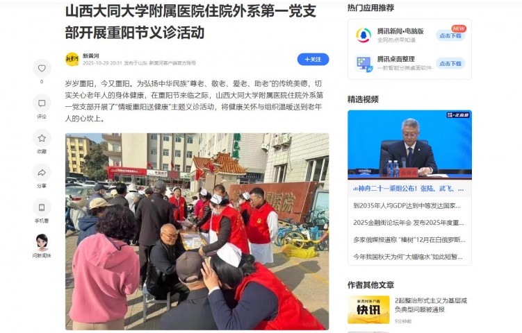岁岁重阳,今又重阳。为弘扬中华民族“尊老、敬老、爱老、助老”的传统美德,切实关心老年人的身体健康,在重阳节来临之际,山西大同大学附属医院住院外系第一党支部开展了“情暖重阳送健康”主题义诊活动,将健康关怀与组织温暖送到老年人的心坎上。
