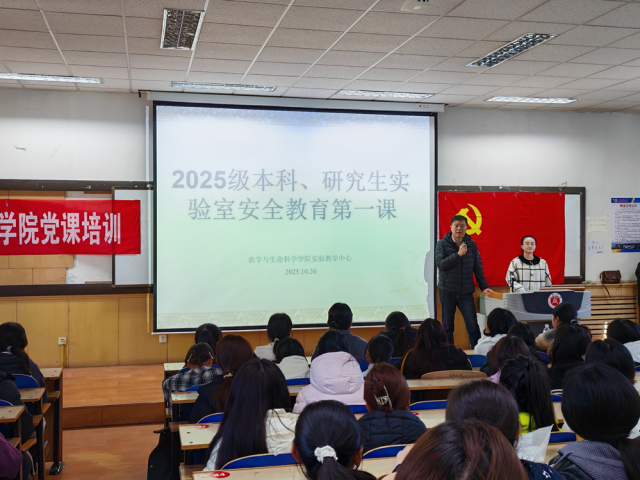 为全面加强实验室安全管理,强化新生安全意识,预防和减少安全事故发生,切实保障师生生命与财产安全,10月26日上午,农学与生命科学学院在明哲楼举办新生实验室“安全教育第一课”。学院实验中心全体教师、2025级全体本科及研究生参加此次活动。