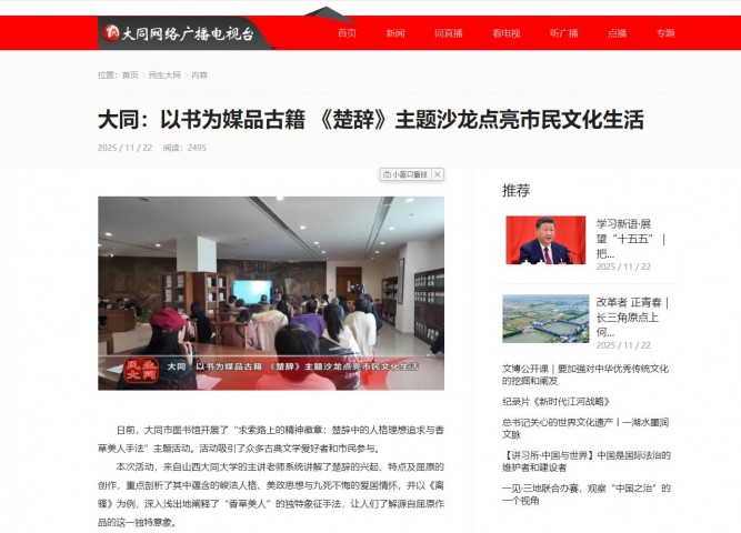日前,大同市图书馆开展了“求索路上的精神徽章:楚辞中的人格理想追求与香草美人手法”主题活动。活动吸引了众多古典文学爱好者和市民参与。